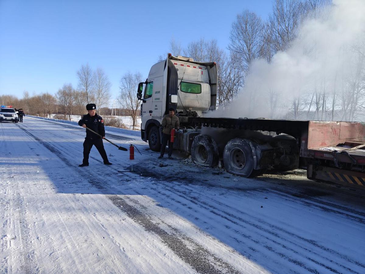 11月28日9时30分左右,佳木斯边防管理支队弄桥边防派出所接到王姓男子到派出所报案称,102国道韩丛沟路段,一辆17.5米长的挂车因车轮制动系统故障,轮胎起火。已经蔓延至主油箱周围,情况十分紧急。