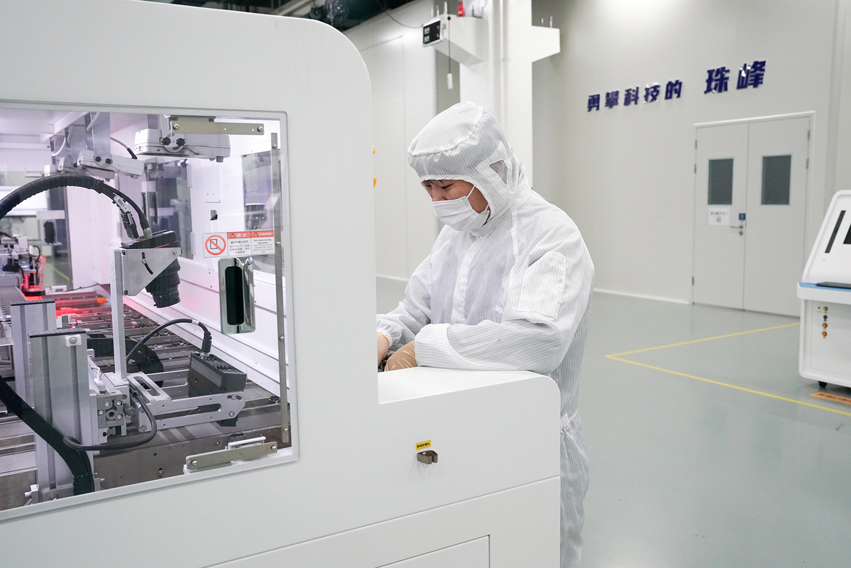 2025年11月26日,在苏州华星源创科技有限公司,工程师们试用先进的封装芯片。图片来源:新华社